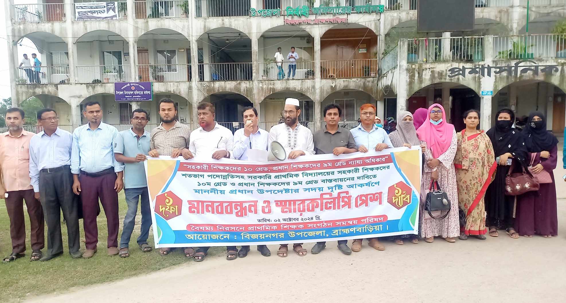০২ অক্টোবর বুধবার বিকালে উপজেলা পরিষদ চত্ত্বরে মানববন্ধন করেন উপজেলার বিভিন্ন প্রাথমিক বিদ্যালয়ের শিক্ষকরা এবং উপজেলা নির্বাহী অফিসারের মাধ্যমে প্রধান উপদেষ্টা বরাবর স্মারকলিপিও প্রদান করেন।